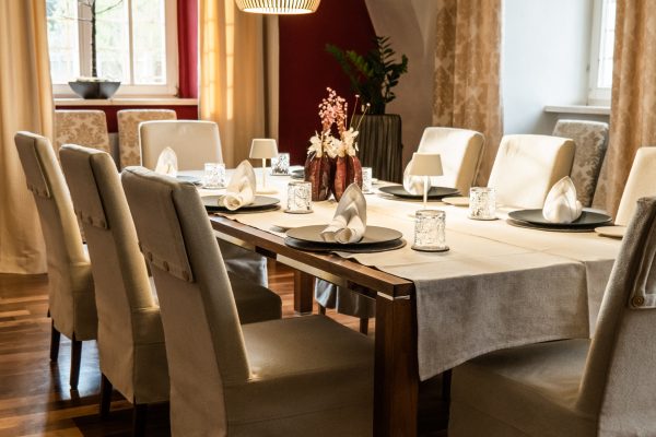 Im Erdgeschoss wurde ein Restaurantbetrieb eingerichtet, der ganzjährig die repräsentativen Räumlichkeiten im Schloss und dem Nebengebäude für Feierlichkeiten, Firmen- und Familienjubiläen u. andere Anlässe anbieten kann!
